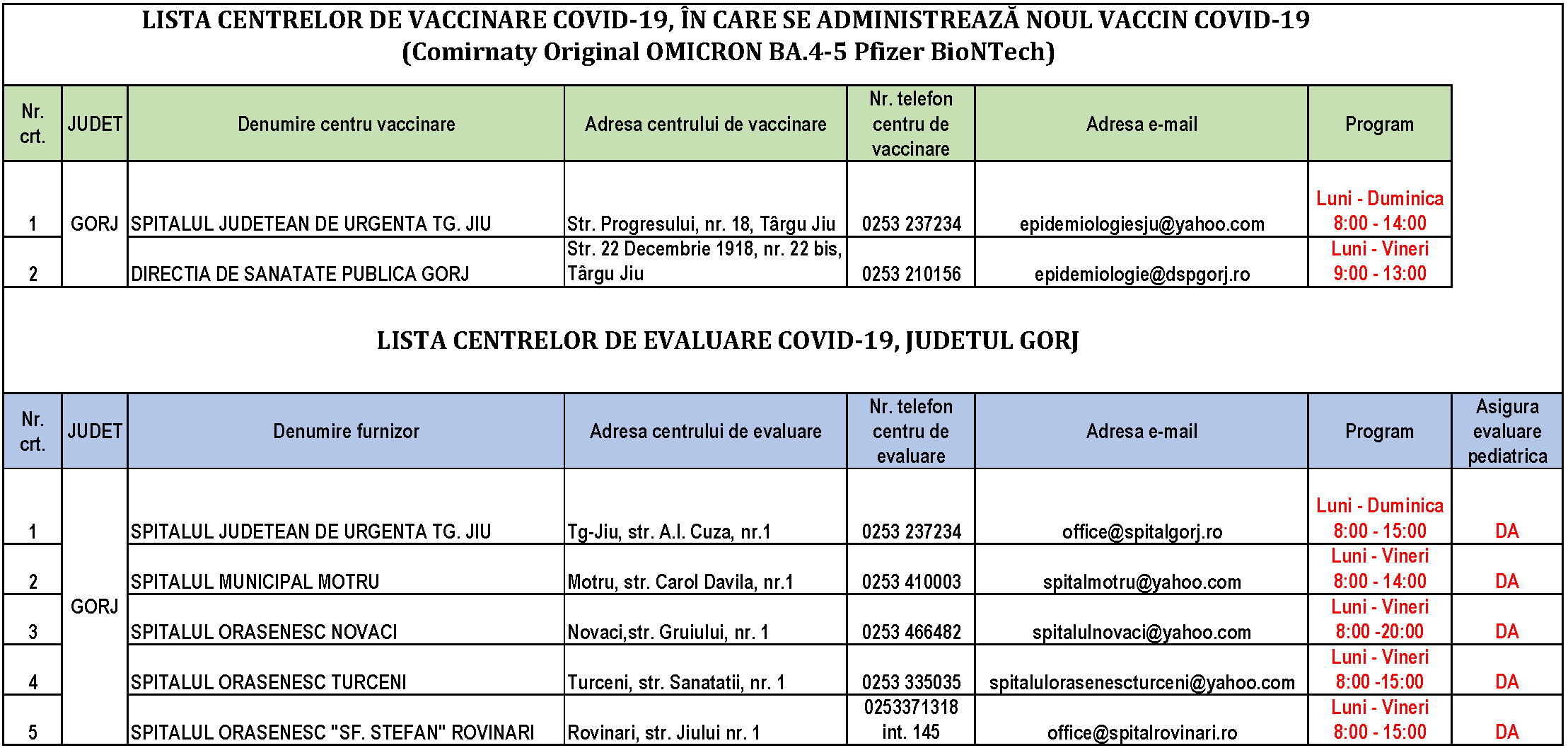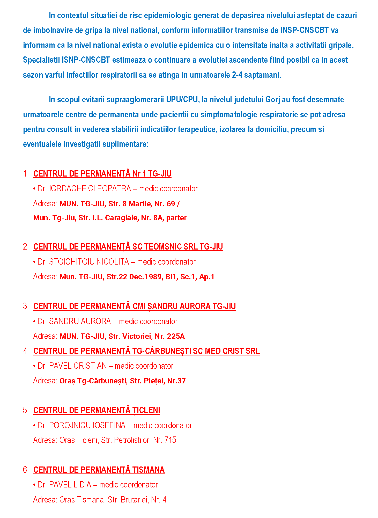 LISTA CENTRELOR DE EVALUARE VIROZE RESPIRATORII DIN JUDEȚUL GORJ
