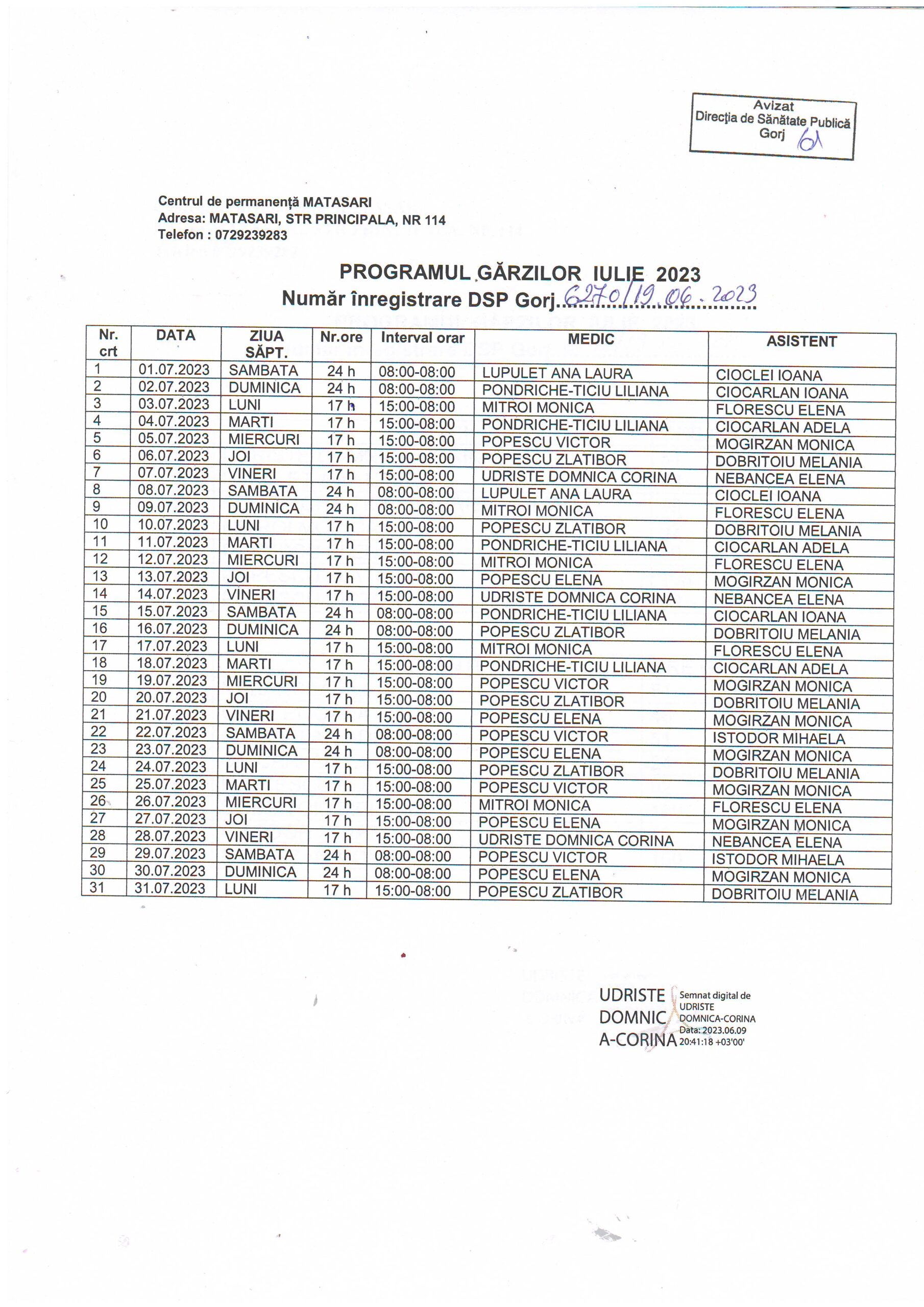 | 03 | CENTRUL DE PERMANENȚĂ MĂTĂSARI • Dr. UDRIȘTE DOMNICA CORINA – medic coordonator program gărzi |