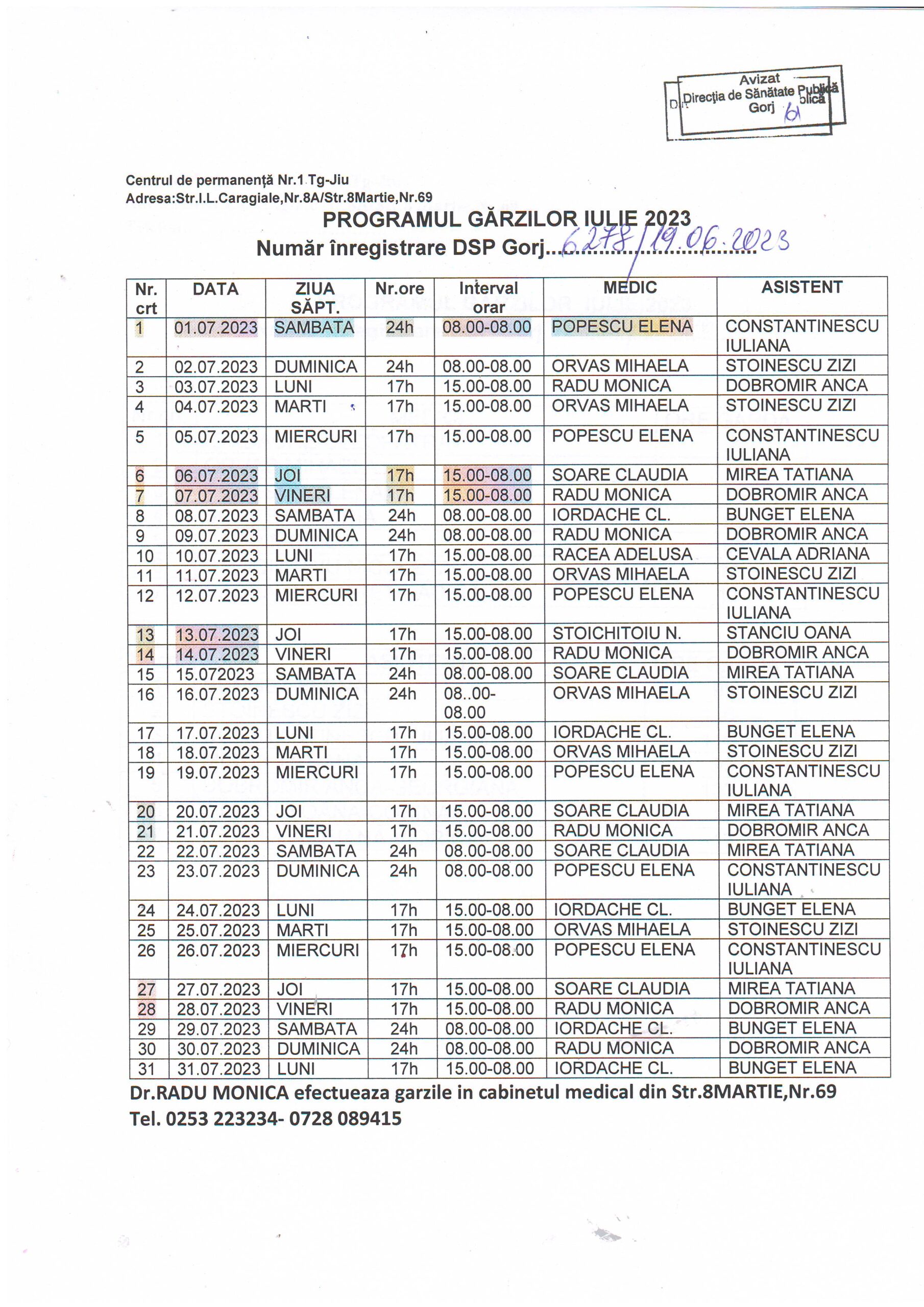 | 08 | CENTRUL DE PERMANENȚĂ Nr 1 TG-JIU • Dr. IORDACHE CLEOPATRA – medic coordonator • SEDIUL: MUN. TG-JIU, Str. I.L.Caragiale, nr. 8A program gărzi |