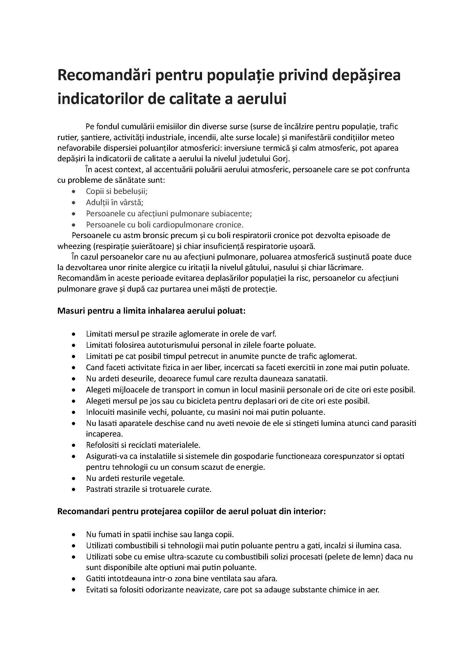 – Recomandări pentru populație privind depășirea indicatorilor de calitate a aerului